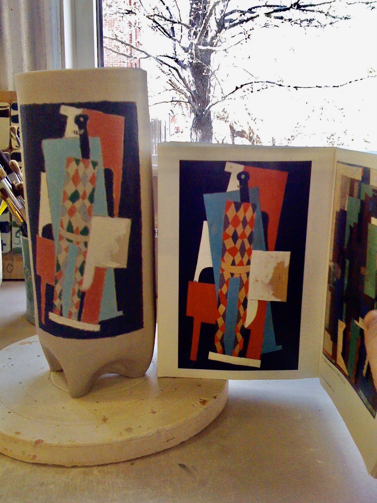 My first attempt at recreating a Picasso in clay. This is Harlequin originally painted by Pablo Picasso in 1915, A form of synthetic cubism. The vase was rolled then molded by hand. I then etched the outline of the painting when semi dry and painted it in.